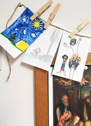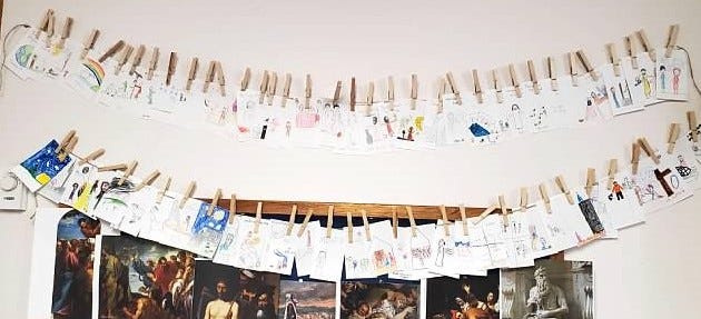 5) Looking at great works of art that correspond to the Bible passage read. This aids in deeper reflection and memory of the passage. This is everyone’s favorite part. The teacher holds up an art print and gives a full minute of silence for everyone to look at it closely. Then the print is placed face down and the students are asked to tell back about the work of art. The littlest ones can give a full description of the expressions, the colors, the lighting, the dog hiding in the corner, and if it’s about the apostle Peter then there are sure to be keys lying around. Some students even begin to pick up on the style and will guess the artist. Then the teacher will give the artist’s name and maybe a few interesting facts about it. The teacher is careful to mention that this is what the artist imagined in their mind when they read the same passage and this communicates that people in history knew these stories too and they thought they were important enough to create something so wonderful. I also suspect that this practice can train children to meditate, to sit in silence, to wonder, and to notice symbolism and themes.