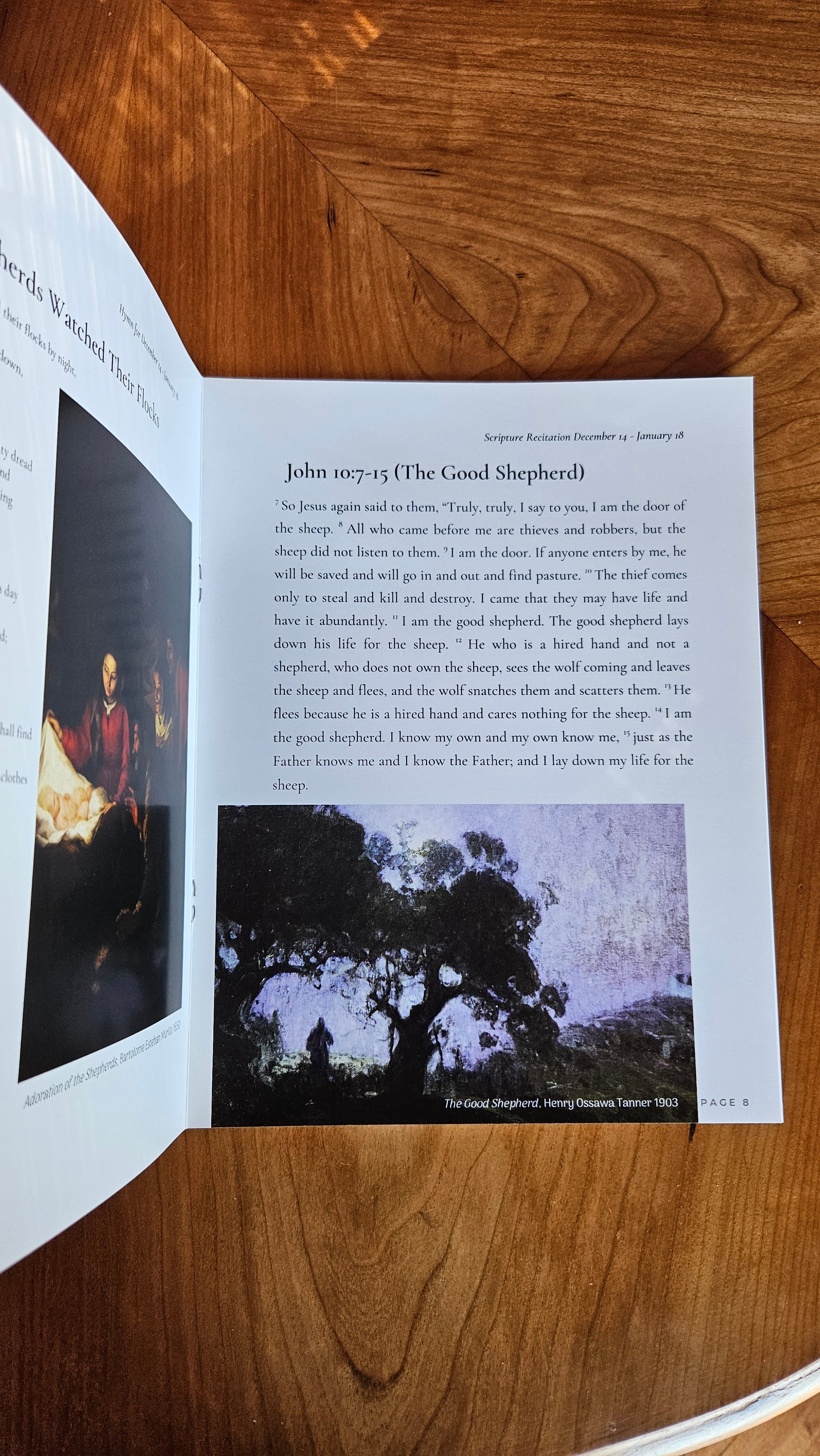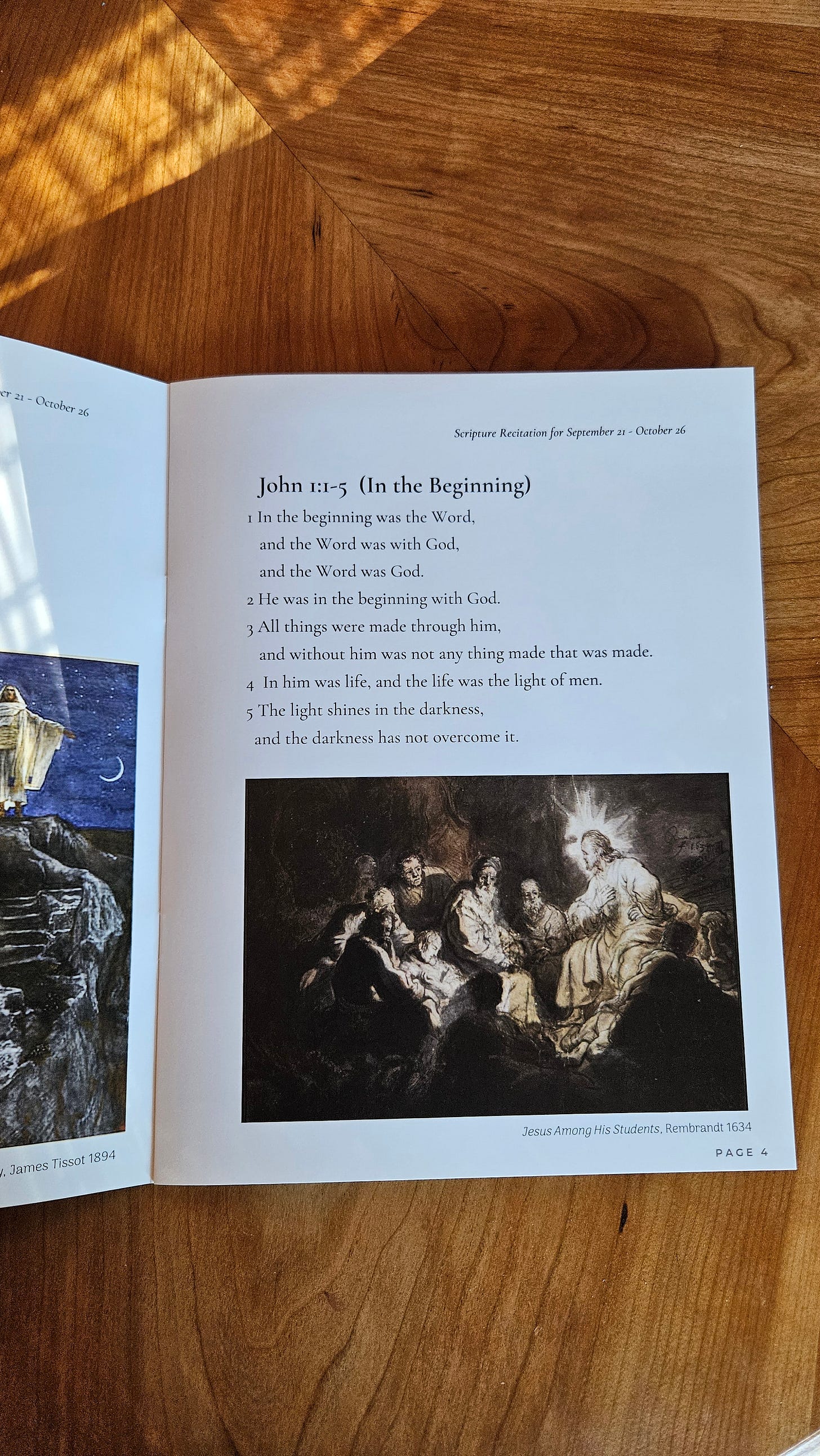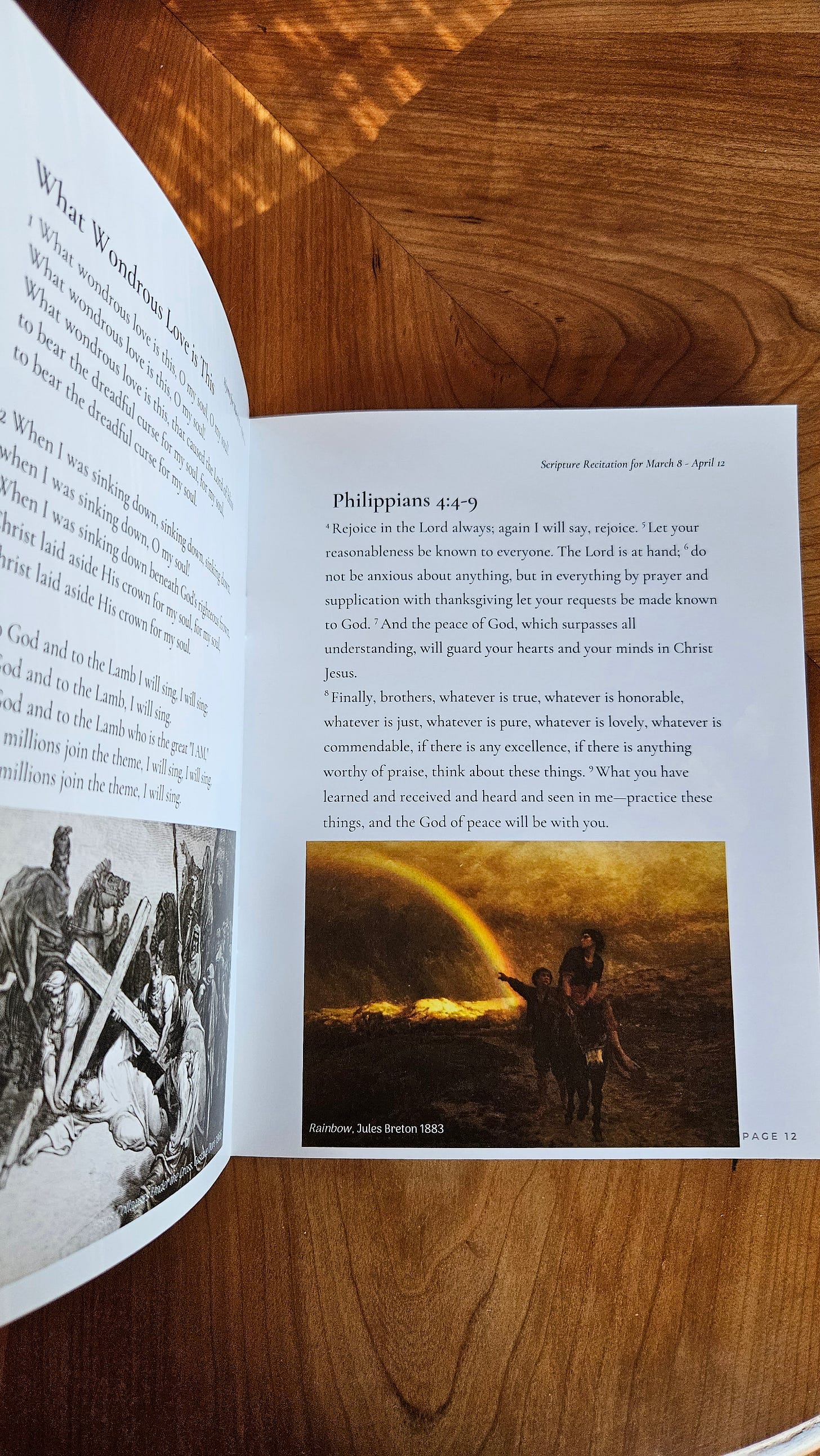 We cover one hymn and one scripture passage every six weeks. I put the hymn on the left page and the scripture passage on the right page. Here is a sampling of what we've covered: