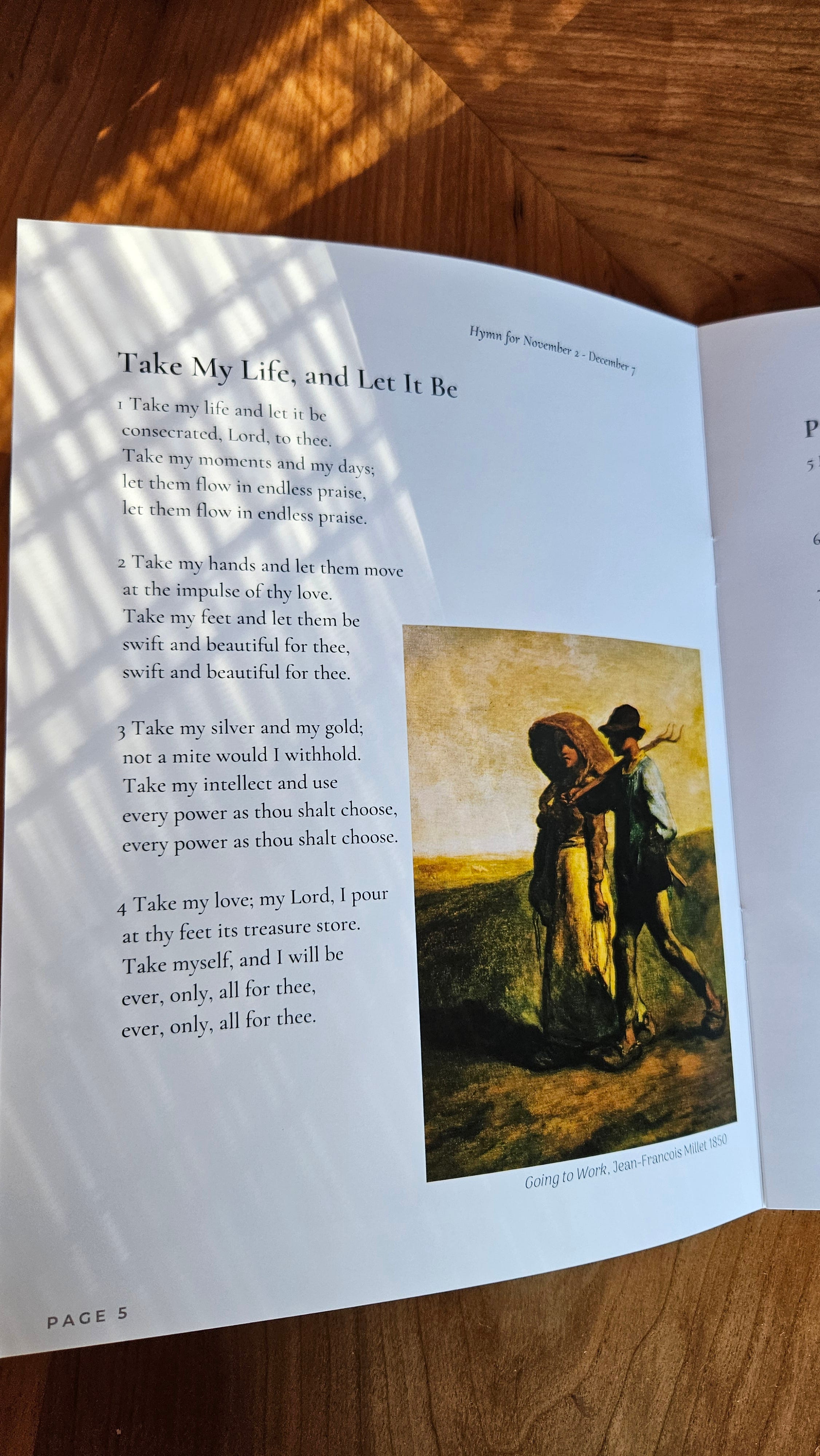 Search for quality public domain art and save it to your computer. I look for beautiful art to compliment the hymns or bible passages. It's easy to upload the art into Canva if you click on “uploads” on the left side of your project. From there, just drag and resize onto the pages.